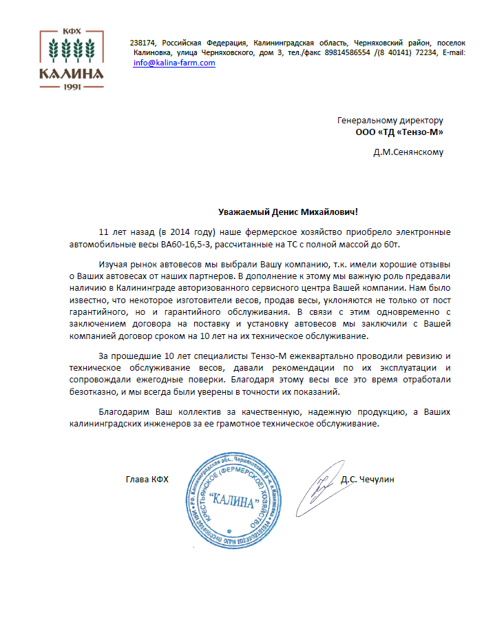 Выражаю благодарность Вашей компании за оперативную поставку и сдачу в эксплуатацию автовесов ВА «САХАЛИН» на нашем зернокомплексе в п.Звеньевое. Это позволило нам организовать компьютерный учет уборочной компании 2019 г.