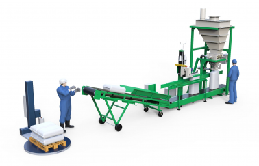 Линия позволяет расфасовывать различные типы сыпучих продуктов в открытые мешки до 50 кг. Обслуживает линию оператор фасовки и рабочий укладки заполненных мешков на поддон.