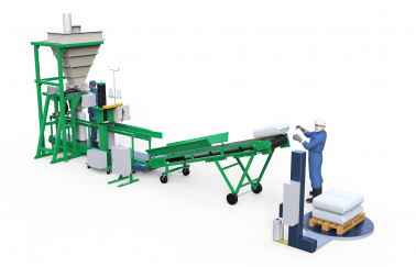 - Зашитый мешок с конвейера отвода заполненных мешков к мешкозашивочной машинке попадает на наклонный конвейер, который поднимает его на уровень плеча рабочего укладки заполненных мешков на поддон