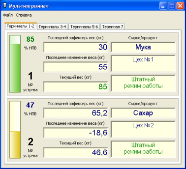 В режиме реального времени программа может отображать для каждого весового терминала мнемосхему загрузки емкости и следующие поля: