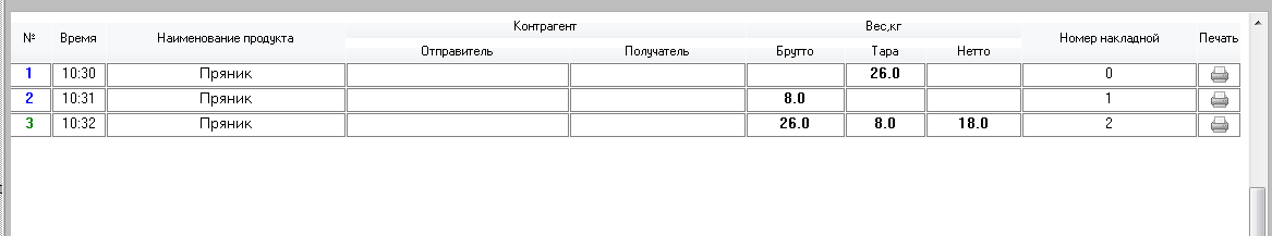 На рис. 2 показан пример журнала взвешиваний. Карточки №1 и 2 являются неполными (отсутствует вес НЕТТО или БРУТТО), поэтому выделяются синим цветом. Тогда как взвешивания 3 является полным, и отображается зеленым цветом. Для завершения взвешивания необходимо открыть нужную весовую карточку, для чего кликнуть по нужной записи два раза мышкой и произвести недостающее взвешивание. После этого необходимо нажать на кнопку «Сохранить».