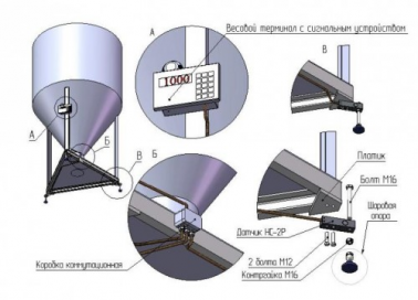 Устройство состоит из трех или четырех тензорезисторных датчиков, которые монтируются под опоры смесителя. Текущий вес продукта в смесителе отображается на основном дисплее весоизмерительного преобразователя (терминала). «Агродоз 163» оснащается терминалом с двумя дисплеями. На второй индикатор выводятся показания счетчиков компонентов смеси. В соответствии с параметрами рецепта, хранящимися в памяти терминала, в процессе загрузки выдаются звуковые сигналы, информирующие оператора об окончании набора очередного компонента и необходимости перехода к следующему компоненту. Комплект тензодатчиков с терминалом может быть откалиброван, как на предприятии-изготовителе, так и на месте эксплуатации.